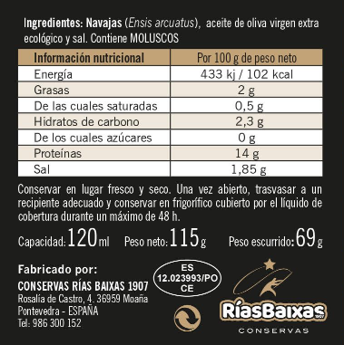 Y aunque la navaja de Finisterre es una delicia en sí misma, hemos optado por presentarla en aceite de oliva extra virgen ecológico*.  El resultado es espectacular y te invitamos a comprobarlo.
