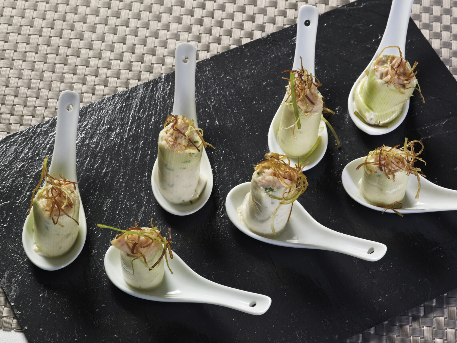 INGREDIENTES 1 lata de bonito en aceite de oliva Puerros Queso fresco Mayonesa Cebolleta Perejil ELABORACIÓN Escaldar unos puerros, cortados en 5 cm, y retirar con cuidado las láminas. Rellenarlas con una mezcla hecha a base de bonito, queso fresco, mayonesa, cebolleta y perejil. Decorar el canelón con unas láminas del bonito y hebras de…